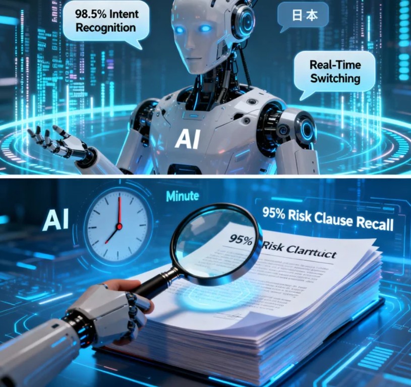 Financial smart customer service, legal contract review, and multilingual translation models are in production. The service bot achieves 98.5% intent accuracy with live Chinese-English-Japanese switching; the legal model reviews thousands of pages in minutes with 99% risk-clause recall; the translation model outperforms major clouds in BLEU and runs on-premise for regulatory compliance. Few-shot fine-tuning lets clients adapt models to their domains within one week using proprietary data.